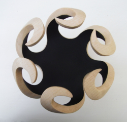 "Spiral shaped pieces of sycamore, pear and chestnut interlocked with black epoxy resin. 210 mm diameter. Airbrushed. Ref 13.13