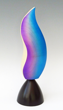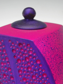 Sycamore. 125mm wide x 75 mm deep x 135mm high. Turned on 5 axes, some using therming method that turns 2 teapots at a time to create balance. Sides textured with spherical burrs. Purple overpainted with blue using dry brush technique and sponge. Ref 20.10
