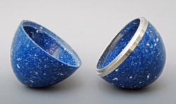 From 12 mm thick Corian off-cuts (kitchen worktop material). 65mm diam. Egg with pewter ring at half joint. Ref 15.07